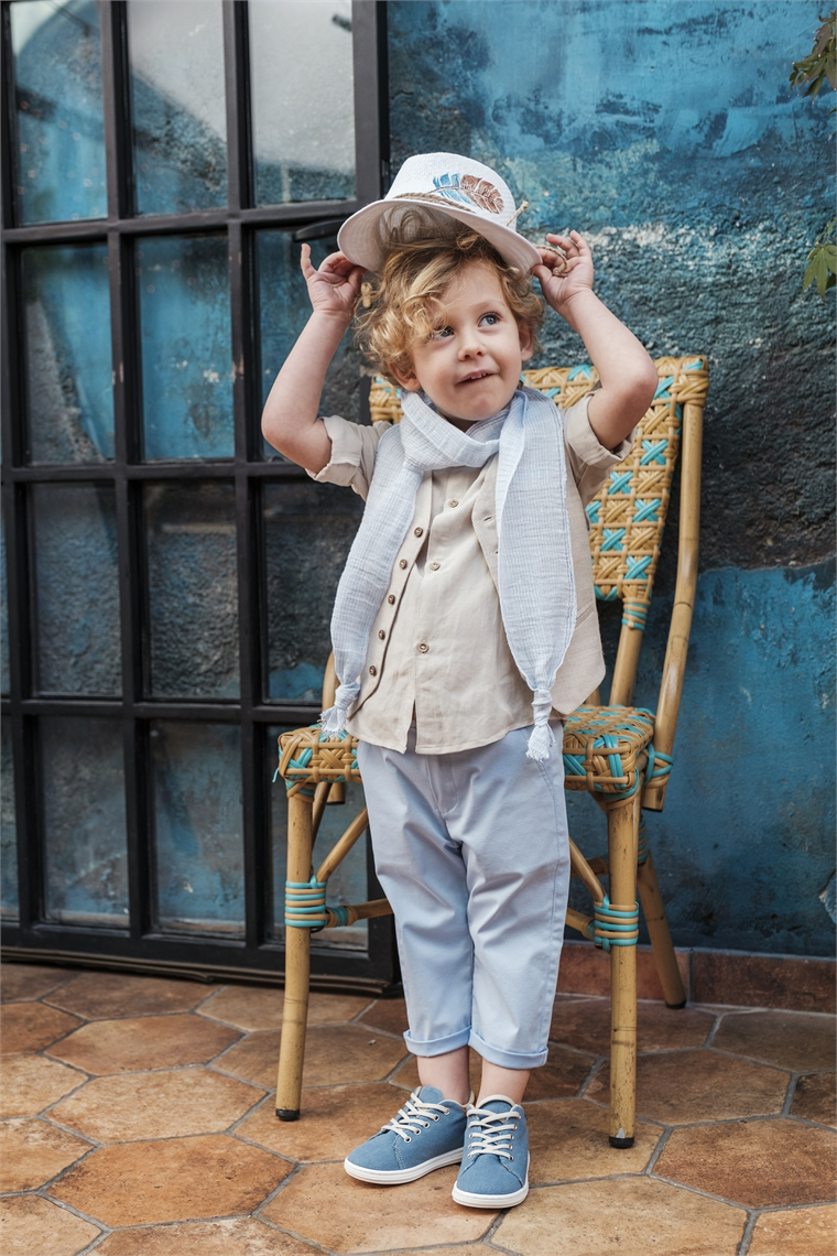 Ο Aggelos είναι ένας chic συνδυασμός του μπεζ με το σιέλ. Αποτελείται από ψιλό καρό σίελ παντελόνι, μπεζ μονόχρωμο πουκάμισο και μπεζ γιλέκο ψάθα style. Απαραίτητο το αξεσουάρ το σιέλ φουλάρι, η μπεζ ζώνη και το λευκό καβούρι.