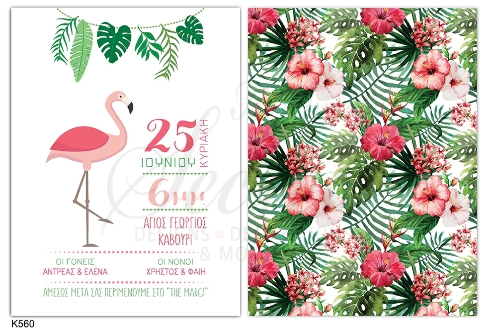 Ιδιαίτερο προσκλητήριο βάπτισης για κοριτσάκι με θέμα το φλαμίνγκο και τα λουλούδια, με φάκελο σε χρώμα της επιλογής σας. Το προσκλητήριο είναι μονόκαρτο με εκτύπωση και στις 2 όψεις. Διαστάσεις προσκλητηρίου:15 x 20 cm – Kωδικός : K560