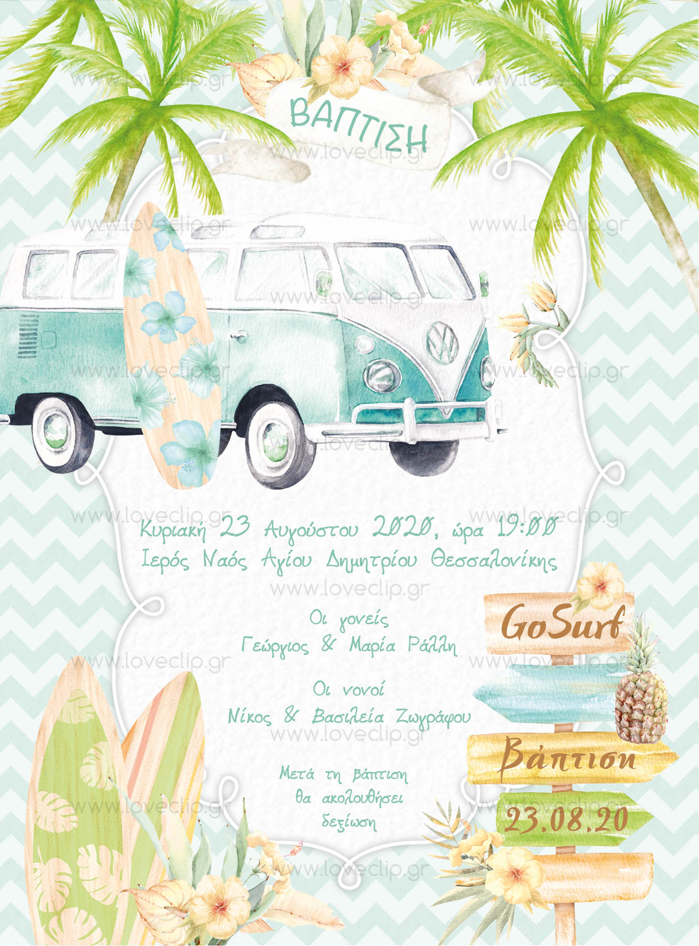 Ιδιαίτερο προσκλητήριο βάπτισης για αγοράκι με θέμα βανάκι, σανίδες του σέρφ και κοκοφοίνικες Το προσκλητήριο είναι μονόκαρτο με exlusive τυπωμένο(προσωποποιημένο) φάκελο (κάρτα: 14,5Χ20εκ – φάκελος: 15Χ21εκ) Το εικαστικό προσαρμόζεται και είναι διαθέσιμο σε όλα τα προϊόντα που αφορούν: μπομπονιέρες, candy bar, διακόσμηση, βιβλία ευχών και σετ νονού.